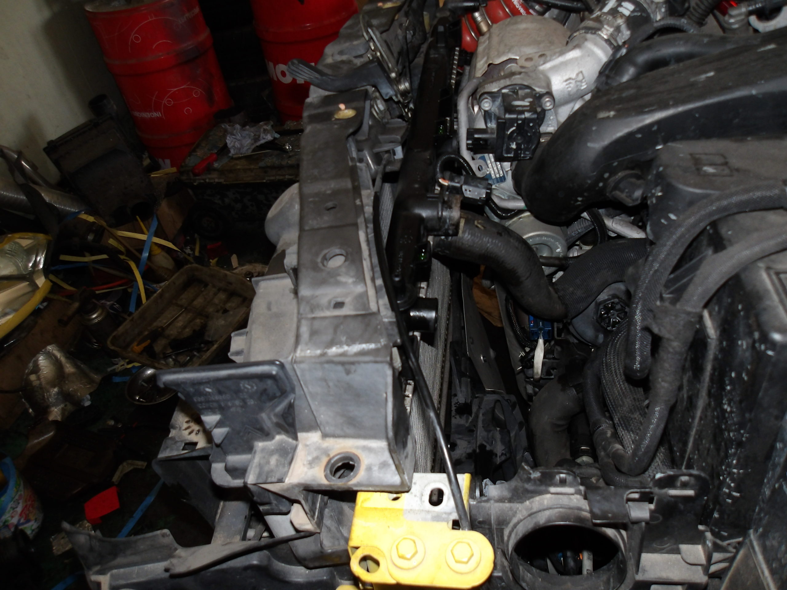 DS3はエンジンルームが狭く、ラジエターがそのままでは外れませんので、プラスチック製のラジエターサポートをずらしてスペースを作ります。