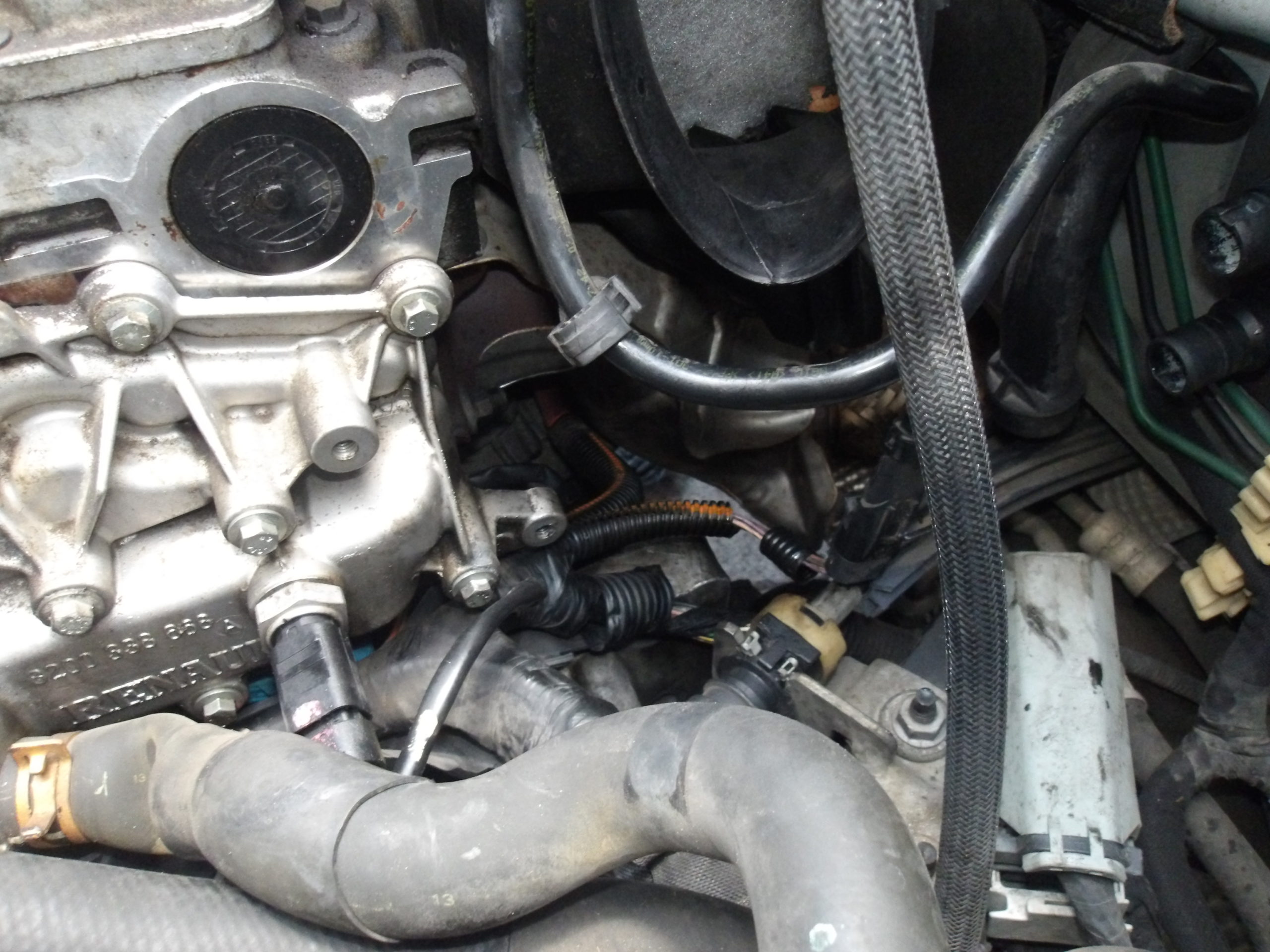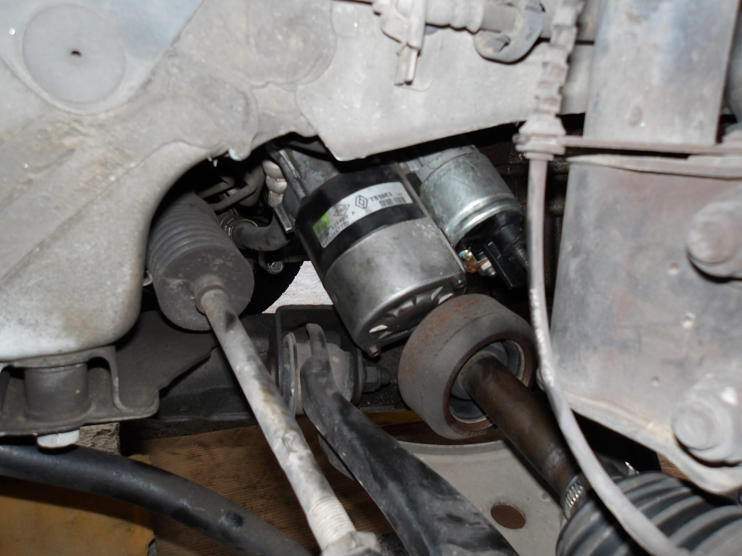 バッテリー電圧は正常で、ソレノイドに直接電源繋げても飛び込まないので、セルモーターのソレノイドバルブ不良と判断し、社外新品に交換します。セルモーターはこの画像の右真ん中辺りにありますが、この画像ではわかりません。